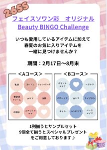 『Beauty Bingo Challenge』始めます❢ 2026.02.17 本日2/17より フェイスソワン彩オリジナル Beauty Bingo Challenge 始めます❢ いつものご愛用スキンケアに加えて スペシャルケアや 春夏のメイクアイテム、ボディヘアアイテムなど 新しいお気に入りを探してみませんか? お悩みやご希望に合わせて ぴったりのアイテムをご提案いたします♪ 列が揃うたびにプレゼントがあります🎁 期間は8月末まで ぜひチャレンジしてみてくださいね💖